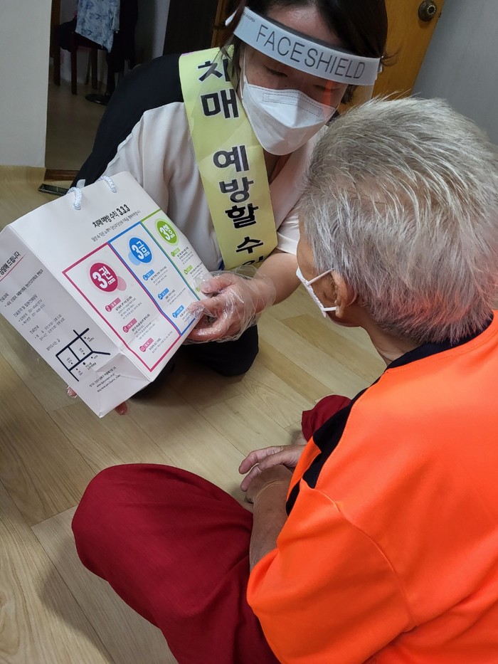 경기 안산시 시립노인전문병원은 ‘치매 극복의 날(9월21일)’을 맞아 ‘찾아가는 치매인식개선 캠페인’을 진행했다. 사진은 최근 캠페인을 통해 병원 관계자가 치매노인 가구를 방문해 ‘치매예방수칙 3·3·3’, 치매예방운동 등을 안내하고 있는 모습.(사진제공=안산시청)