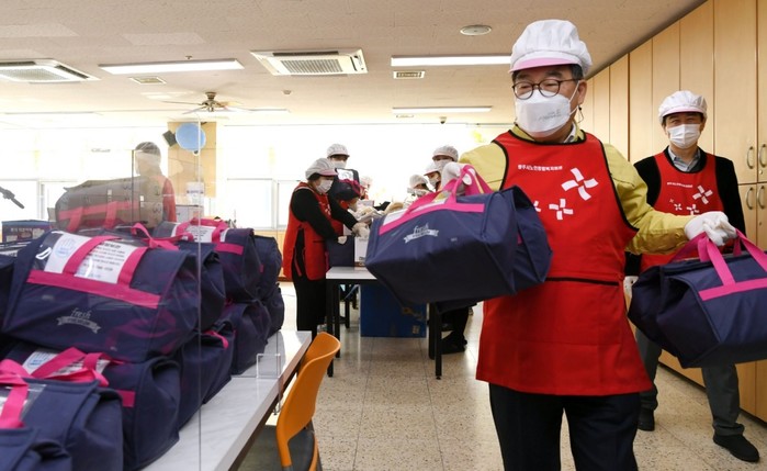 신동헌 경기 광주시장은 최근 광주시노인복지관을 방문해 가정형편이 어렵고 거동이 불편해 점심을 거르는 노인 140명에게 주 1회 식품을 조리해 집으로 배달하는 재가노인 식사배달 사업 조리식품 포장작업에 참여했다. 사진은 이날 신 시장이 포장한 음식을 나르고 있는 모습. (사진제공=광주시청)