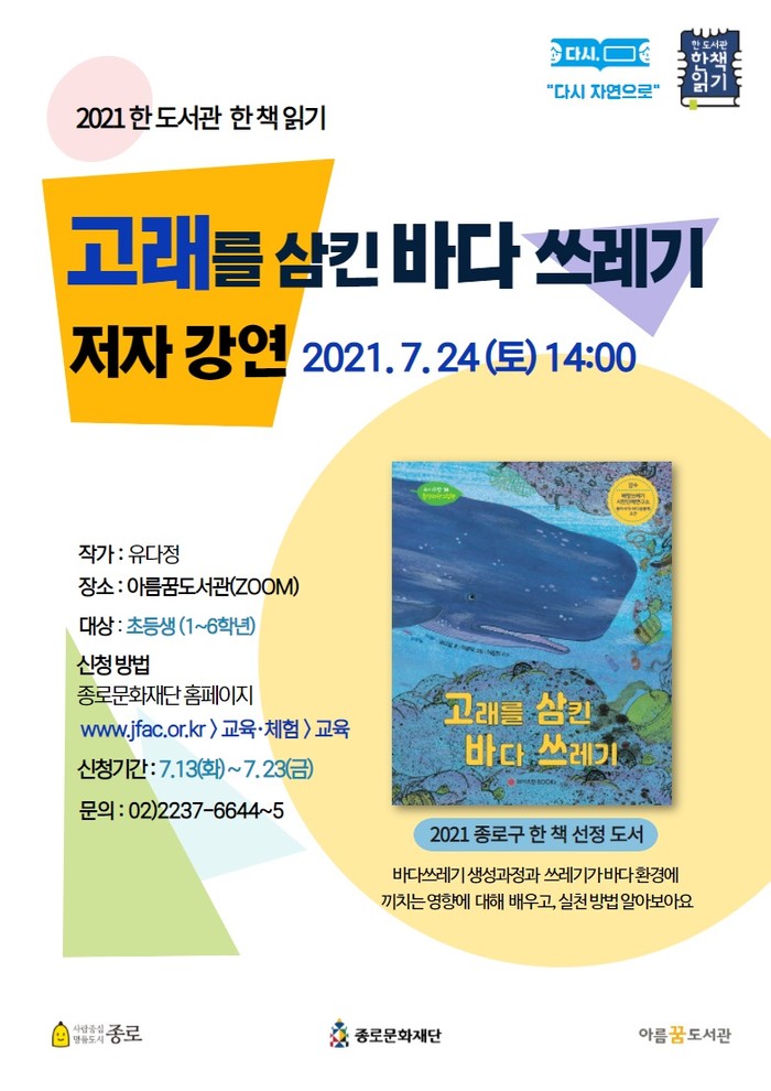 먼저 이달 24일에는 오후 2시부터 아름꿈도서관에서 <고래를 삼킨 바다 쓰레기>의 저자 유다정 작가를 초청해 온라인 특강을 연다. 쓰레기 생성 과정과 함께 생물에게 미치는 영향을 알아보고 환경 보호를 위해 일상 속에서 실천할 수 있는 크고 작은 방법들을 배우는 시간으로 구성했다.