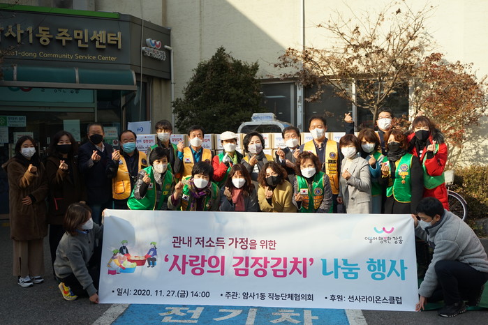 서울 강동구 암사1동은 최근 ‘사랑의 김장 나눔’ 행사를 개최했다. 암사1동은 직능단체협의회·선사라이온스클럽·패밀리클럽의 후원으로 김장김치 1400kg을 구입했으며, 자원봉사자들이 지역내 홀몸노인 등 취약계층 200가구에 직접 전달했다. 사진은 이날 봉사자들이 기념촬영을 하는 모습. (사진제공=강동구청)
