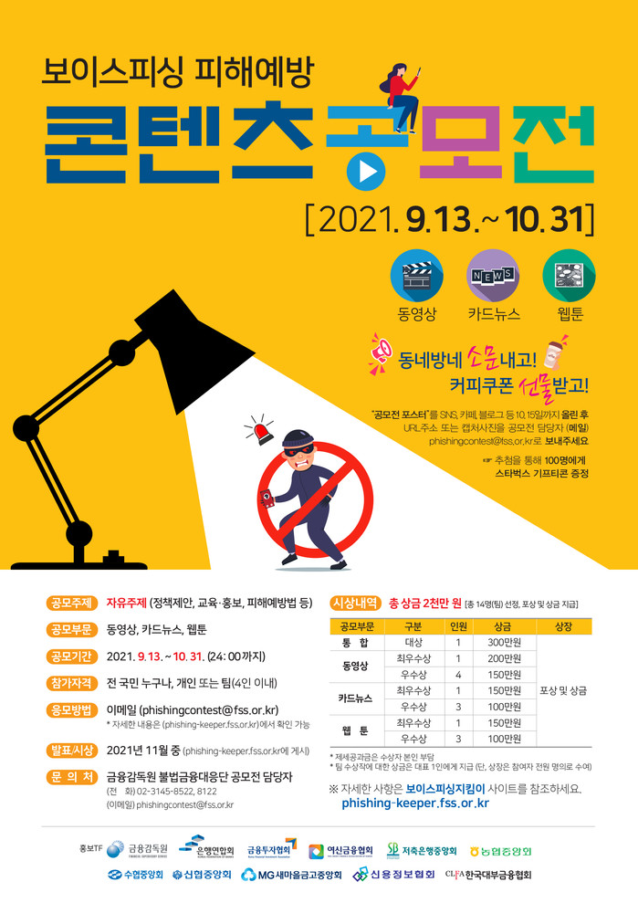 [시민일보 = 여영준 기자] 금융감독원 및 각 금융협회·중앙회(10개)는 보이스피싱에 대한 대국민 경각심을 제고하고, 효과적인 피해예방 교육·홍보를 위해 '보이스피싱 피해예방을 위한 콘텐츠 공모전'을 공동 개최한다.