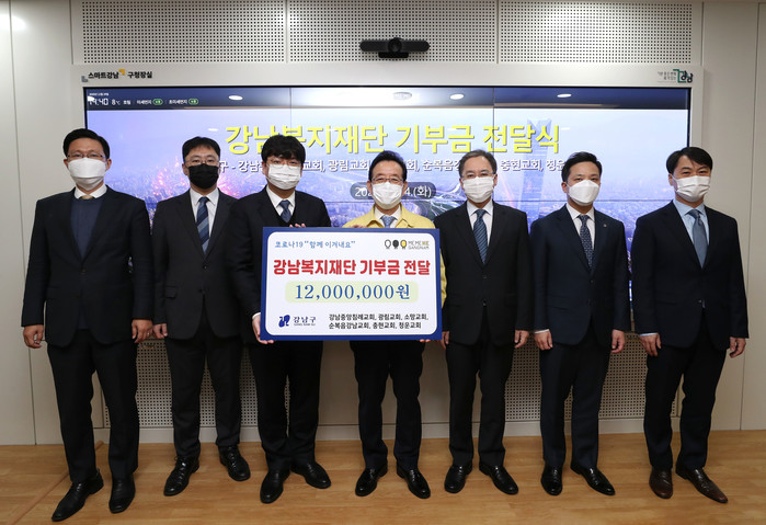 서울 강남구 지역내 교회들이 24일 코로나19 확산 방지를 위해 지급된 재난지원금을 겨울철 어려운 이웃들을 위해 사용해달라며 강남복지재단에 기부했다. 사진은 기부금 전달식에 참석한 정순균 구청장(가운데)과 교회 관계자들이 기념촬영을 하고 있는 모습. (사진제공=강남구청)