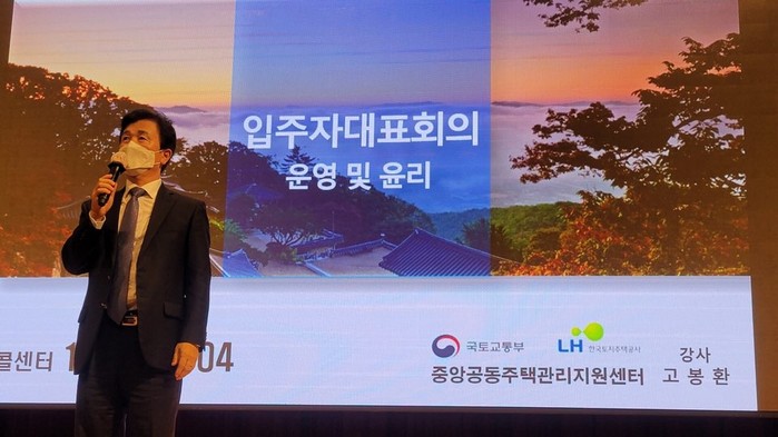 오후에는 LH 토지주택대학교 옥희석 전임교수로부터 입주자대표회의 구성원을 대상으로 ‘사업자선정지침 및 장기수선계획 수립‧조정에 관한 사항’에 대한 교육과 LH 중앙공동주택지원센터 고봉환 강사의 ‘입주자대표회의 운영 및 윤리에 관한 사항’을 주제로 한 교육이 이어졌다.