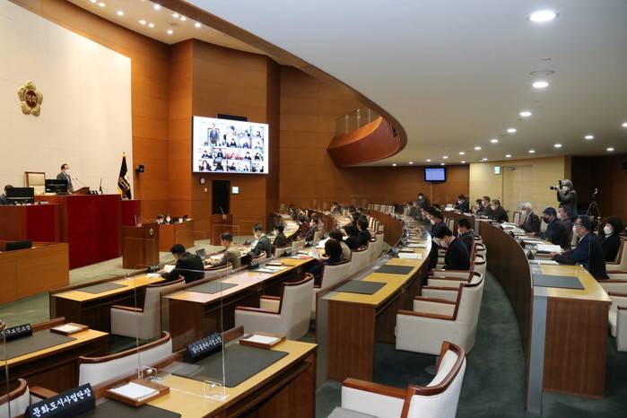 25일에 열린 본회의에서는 ‘제260회 성남시의회 임시회 회기 결정의 건’을 의결하고, ‘2021년 제1회 일반 및 특별회계 세입 추가경정예산안 제안설명의 건’ 청취 후 ‘2021년도 주요업무계획 청취의 건’을 의결했다. 본회의는 코로나19로 인한 사회적 거리두기를 실천하며 본회의장 입장 통제하에 영상회의로도 이뤄졌다.