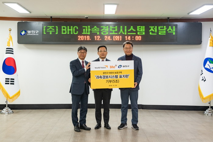 bhc치킨은 전달식을 통해 광진구내 초등학교 앞에 차량 속도를 조기 표출하는 과속경보시스템 표지판 설치에 합의하고, 내년부터 본격 설치에 들어가 어린이 교통안전을 강화하는 데 기여한다.