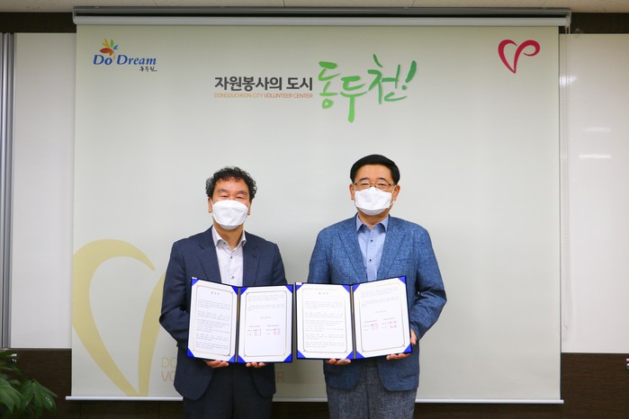 경기 동두천시자원봉사센터가 최근 동두천시노인복지관과 '노인일자리 및 노인복지 증진과 자원봉사 활성화'를 위한 협약을 체결했다. 사진은 협약 체결 후 양 기관 관계자들이 기념촬영을 하는 모습. (사진제공=동두천시청)