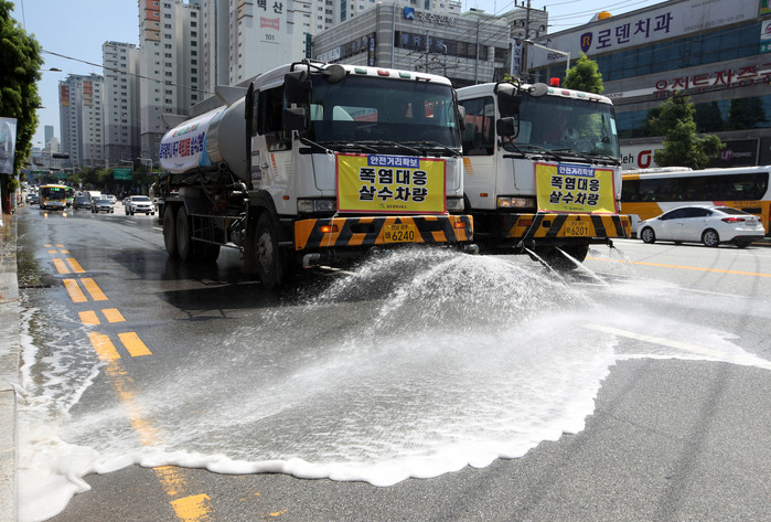 전국에 폭염특보가 내려진 18일 오후 광주광역시 북구 운암동 일대에서 북구청의 살수차가 햇볕에 달궈진 도로에 물을 뿌리고 있다.