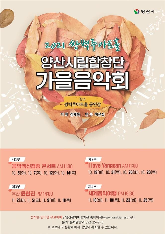이번 음악회는 4가지 프로그램으로 구성되어 있으며,합창·독창·중창 등 다양한 레퍼토리로 이루어진 음악백신접종콘서트, 시립합창단이 기획하고 연출한 음악극인 양산시민 노래자랑 ‘I love Yangsan'은 10월 한달간 브런치 콘서트로 진행된다.
