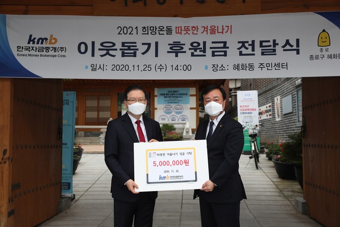 서울 종로구 혜화동 주민센터로 지역내 어려운 이웃을 위해 사용해 달라며 명륜교회·혜성교회 등에서 성금과 라면상자 등이 줄이어 도착하고 있다. 사진은 최근 열린 따뜻한 겨울나기 성금 전달식에서 한국자금중개 이승철 대표(왼쪽)와 조두희 혜화동장이 기념촬영을 하고 있는 모습. (사진제공=종로구청)