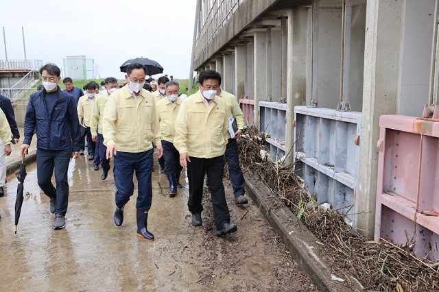| ▲ 명현관 해남군수(가운데)가 지난해 7월 윤재갑 국회의원 및 지역민, 군 관계자 등과 함께 강우 시 상습 침수로 영농 등 피해가 심한 화산면 관동지구 상습 침수지역을 둘러보고 있다. / 사진=해남군 제공 |