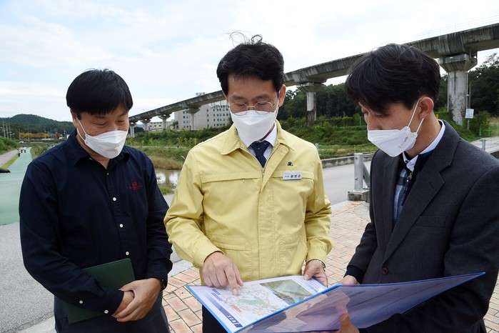 경기 의정부시가 국가안전대진단 점검주간을 맞이해 오는 11월5일까지 공사장과 건축물·시설물 등 11개 유형 76개 시설에 대해 민·관 합동으로 국가안전대진단을 실시한다. 사진은 18일 황범순 부시장(가운데)이 지역내 부용천 자전거도로 현장 점검을 하고 있는 모습. (사진제공=의정부시청)
