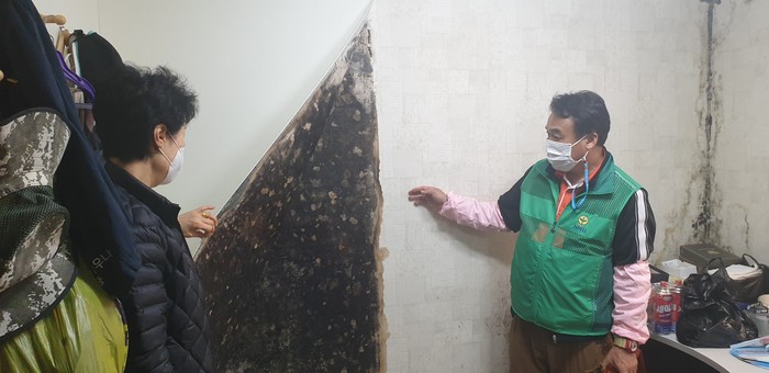경기 수원시 팔달구 인계동 새마을지도자협의회는 24~25일 이틀간 주거환경 정비가 필요한 지역내 어려운 이웃의 가정에 방문해 사랑의 집수리 봉사활동을 진행했다. 사진은 집수리 대상가정의 곰팡이 핀 벽지를 살펴보고 있는 모습. (사진제공=팔달구청)