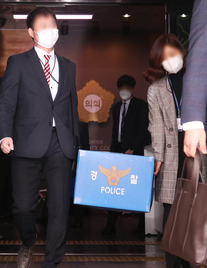▲ 경기남부경찰청 부동산 투기사범 특별수사대가 15일 오후 시흥시의회 A 의원 투기 의혹 관련 경기도 시흥시의회 압수수색을 마치고 압수품을 옮기고 있다. (사진제공=연합뉴스) |