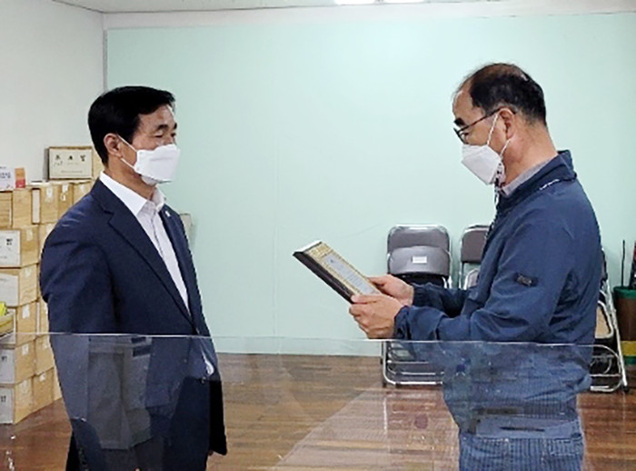 | ▲ 안원기 의원(왼쪽)이 죽성동삼성아파트입주자대표회의로부터 감사패를 받고 있다. (사진제공=서산시의회) |
