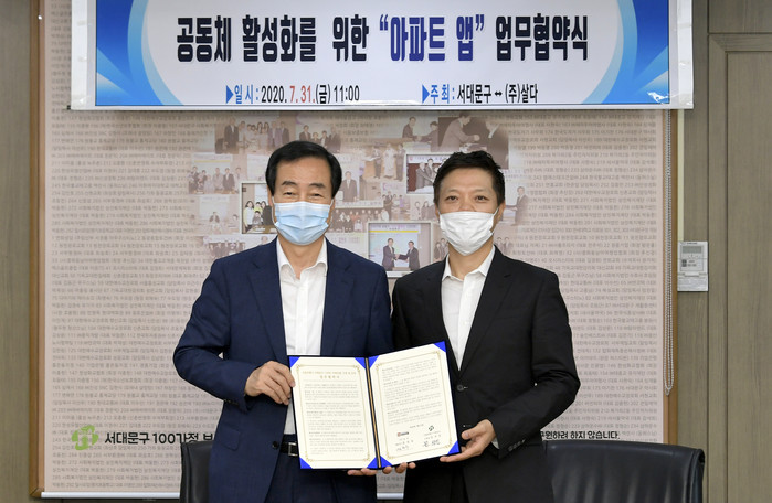 서울 서대문구가 최근 구청 회의실에서 스마트 아파트 앱(APP) 개발업체 (주)살다와 업무협약을 체결했다. 협약으로 앱을 통해 공공정보 제공하고 입주민과의 소통시스템을 정착한다. 사진은 협약식에서 문석진 구청장(왼쪽)과 관계자의 기념촬영 모습. (사진제공=서대문구청)