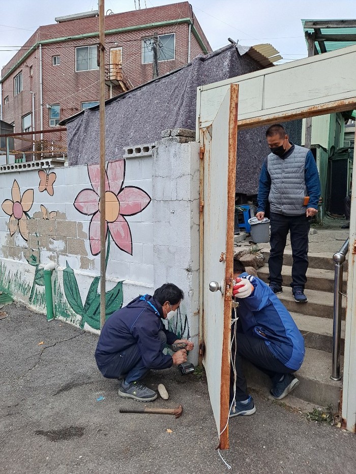 경기 동두천시 로컬드림봉사회는 지난 11월28일 소요동에 위치한 저소득 노인부부 가정을 방문해 주거환경개선 봉사활동을 실시했다. 사진은 봉사회 회원들이 고장난 대문을 교체하고 있는 모습. (사진제공=동두천시청)