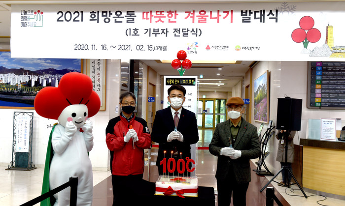 노원구가 최근 구청 1층 로비에서 소외된 이웃을 지원하는 '2021 따뜻한 겨울나기 사업 발대식 및 1호 기부자 전달식'을 열었다. 사진은 오승록 구청장(가운데)이 사랑의온도탑 100도 달성 기원 떡케이크 촛불끄기 행사에서 기념사진을 촬영하고 있는 모습. (사진제공=노원구청)
