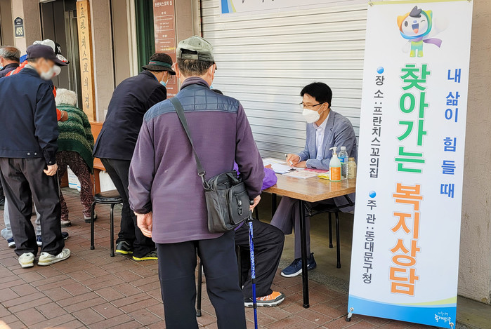 서울 동대문구는 최근 제기동에 있는 프란치스꼬의 집에서 찾아가는 맞춤형 지원 상담을 실시했다. 이날 상담을 통해 국민기초생활 수급·생계곤란 등 내담자들의 복지 궁금증 해소에 크게 기여했다. 사진은 복지 사무관이 지난 20일 찾아가는 복지 상담을 진행하고 있는 모습. (사진제공=동대문구청)
