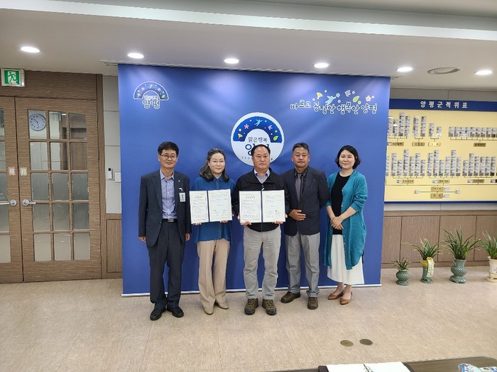 경기 양평군이 10일 지역 인재 양성 및 인성교육 강화를 위해 지역내 대안교육기관인 새이레기독학교와 업무 협약을 체결하고 다양한 방식의 교육적 상호 협력 체계를 구축해 나가기로 했다. 사진은 협약 체결 후 정동균 군수(가운데)가 관계자들과 기념촬영하는 모습. (사진제공=양평군청)