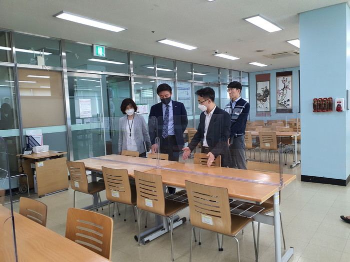 경기 수원시 권선구는 12일 코로나19로 인해 운영 중단 중인 지역내 서호노인복지관(구운동)과 버드내노인복지관(세류동)에 방문했다. 사진은 길영배 구청장(왼쪽 두 번째)이 관계자들과 복지관 내부를 살펴보는 모습. (사진제공=권선구청)