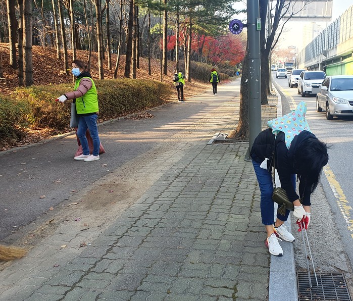 경기 수원시 영통1동 행정복지센터는 최근 봉영로1759번길 일원, 황골공원을 중심으로 통장협의회, 동 직원 등 30여명이 함께 낙엽을 청소하며 거리정비를 실시했다. 사진은 배수로에 쌓인 낙엽을 치우고 있는 모습. (사진제공=수원시청)
