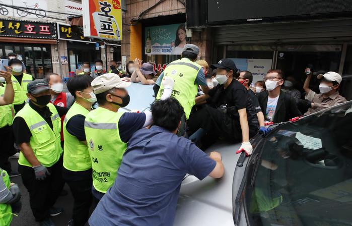 서울중앙지법 집행관·노무자 등이 23일 서울 중구 을지로3가 노가리골목의 '을지OB베어'에서 철거 강제집행을 시도하고 있다. 을지OB베어 건물주 측이 고용한 사설 용역과 중앙지법 집행관·노무자 등은 이날 다섯 번째 강제집행에 나섰으나 청계천을지로보존연대 등 시민단체와 인근 상인들의 반발에 철수했다.