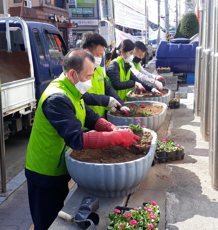 경기 수원시 영통구 매탄2동이 코로나19로 침체된 주민들의 마음을 위로하기 위해 최근 주민들과 함께 행정복지센터내 화단과 골목길 마을정원에 팬지, 비올라 등 봄꽃 3000본을 식재했다. 사진은 가로화단에 꽃을 식재하는 주민들의 모습. (사진제공=영통구청)