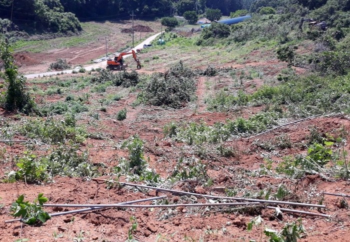 14일 오후 충북 충주시 산척면에서 과수화상병 확진 농가의 사과나무가 매몰되고 있다.