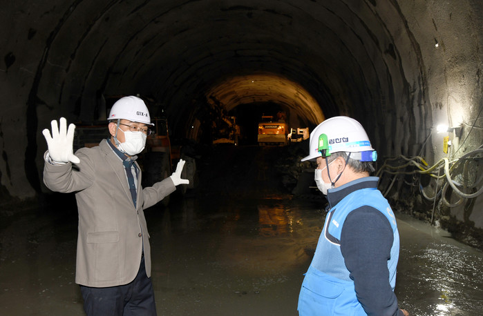 오승록 서울 노원구청장이 최근 서울역 GTX-A노선 공사현장을 방문했다. 오는 2022년으로 예정된 GTX-C노선 본격 착수에 앞서 선행사업 GTX-A노선 현장을 살펴보고 준비하기 위함이다. 사진은 오 구청장(왼쪽)이 공사 현장을 살펴보고 있는 모습. (사진제공=노원구청)