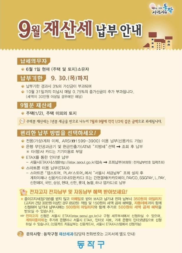 [시민일보 = 여영준 기자] 동작구(구청장 이창우)는 오는 30일까지 ‘9월분 재산세’를 납부해야 한다고 밝혔다.