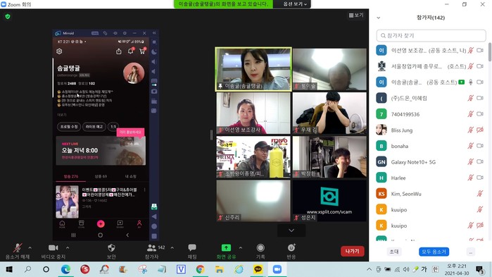 | ▲ 충무창업큐브에서 ‘패션주얼리 K’라이브 커머스 교육을 하고 있는 이솜귤 현직 쇼호스트와 줌(Zoom)으로 1차 프로그램을 비대면으로 교육 받고 있는 수강생들 (사진제공=중구청) |
