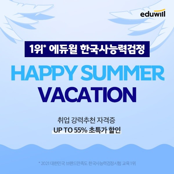 에듀윌 한국사 해피서머 보케이션(HAPPY SUMMER VACATION!) 이벤트는 ▲7일 회계/세무 자격증 데이 45% 할인 ▲8일 금융취업 자격증 데이 40% 할인 ▲9일 취업가산점 자격증 데이 30% 할인 ▲10일 무역취업 자격증 데이 55% 할인 ▲11일 할인율&자격증 앵콜 할인 등으로 예정됐다.