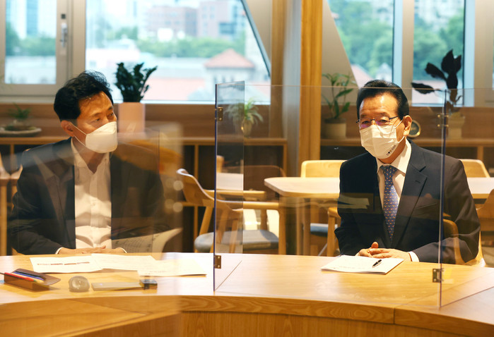 | ▲ 오세훈 시장과의 면담에서 '은마아파트 재건축' 추진에 대해 말하고 있는 정순균 구청장(오른쪽). (사진제공=강남구청) |