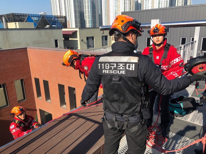 인천 송도소방서 119구조대는 3일 본서 다목적훈련장에서 고층건물 화재 발생시 출입문 접근 및 개방이 쉽지 않은 상황에서 레펠을 이용해 내부로 신속하게 진입해 인명 구조를 하기 위한 ‘레펠장비 조작 숙달훈련’을 했다. 사진은 훈련 진행 모습. (사진제공=송도소방서)