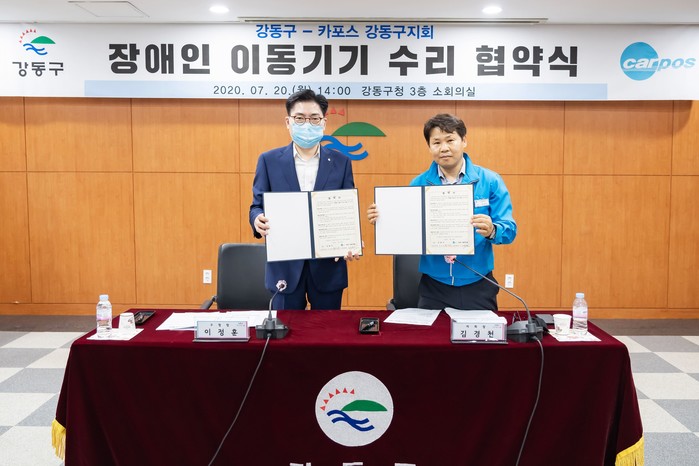 서울 강동구가 장애인 복지 증진을 위해 자동차전문정비조합 카포스 강동구지회와 최근 ‘장애인 이동기기 수리 협약’을 체결했다. 이날 협약에 따라 카포스가 수리업체 요건을 구비하고, 연내에 장애인 이동보조기기 수리에 나선다는 계획이다. 사진은 협약 체결 후 이정훈 구청장(왼쪽)과 관계자가 기념촬영을 하는 모습. (사진제공=강동구청)