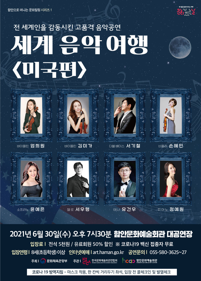 ‘세계 음악 여행 – 미국편’ 공연은 8세 이상 입장가능하며, 입장료는 전석 5천원, 유료회원은 50%할인, 코로나19 백신 접종자(함안군민 1인 1매)에 한해 무료로 관람 가능하다.