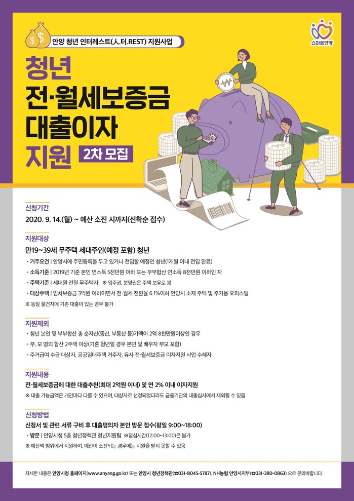 [시민일보 = 홍덕표 기자] 경기 안양시가 청년들에게 전·월세보증금 대출 추천 및 이자지원을 위해 오는 14일부터 '안양 청년 인터레스트(人.터.REST) 지원 사업'의 2차 지원 대상자를 모집한다.