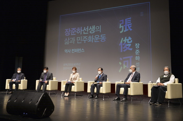 경기 포천시가 10일 ‘장준하 선생의 삶과 민주화 운동’이라는 주제로 역사 컨퍼런스를 개최했다. 이번 행사는 장준하 선생의 역사 및 민주화운동의 가치를 정립하고 ‘장준하 평화관 건립 사업’의 사회적 공감대를 형성하기 위해 마련됐다. 사진은 이날 행사에 참석한 박윤국 시장(오른쪽 세 번째)이 발언을 하는 모습. (사진제공=포천시청)
