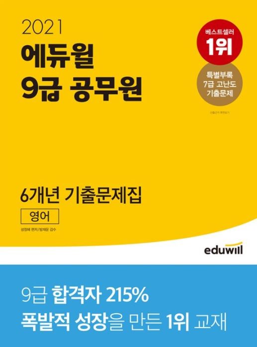 [시민일보 = 여영준 기자] 종합교육기업 에듀윌(대표 박명규) 공무원의 ‘2021 에듀윌 9급 공무원 6개년 기출문제집 영어’가 인기 온라인서점 예스24 공무원 영어 영문독해 부문에서 11월 2주차 베스트셀러 1위를 기록했다.
