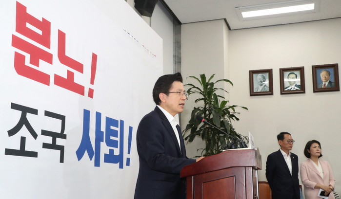 황교안 대표는 이날 오전 긴급 기자회견을 열어 "문 대통령의 독선과 이 정권의 폭주를 막아내려면 결국 자유민주주의 가치 아래에 모든 세력이 함께 일어서야 한다"며 "'조국 파면과 자유 민주 회복을 위한 국민연대'를 제안한다"고 밝혔다.