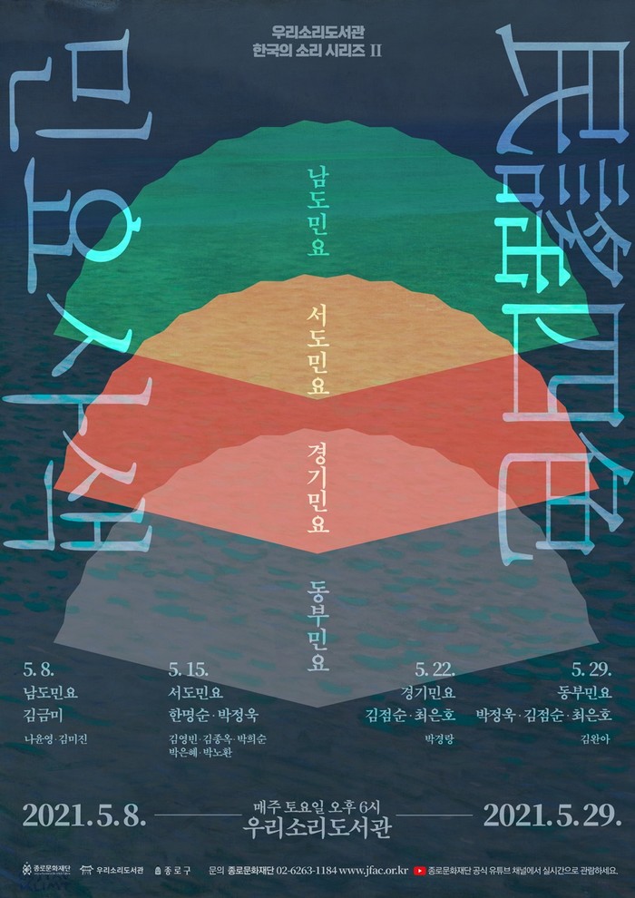 지난 8일 육자배기, 흥타령, 성주풀이 등 ‘남도민요’를 시작으로 ▲15일 평안도와 황해도 지방을 중심으로 불리는 ‘서도민요’의 수심가, 엮음수심가, 해주산염불 ▲22일 서울과 경기도 지방의 ‘경기민요’의 창부타령, 회심곡, 뱃노래 ▲29일 함경도, 강원도, 경상도 지역에서 불리던 ‘동부민요’의 북청애원성, 신고산타령, 궁초댕기, 정선아리랑 등을 만나볼 수 있다.
