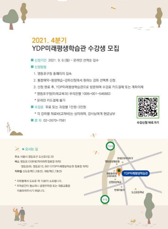 [시민일보 = 여영준 기자]서울 영등포구(구청장 채현일)가 올해 4분기 YDP미래평생학습관 프로그램 수강생을 오는 6일부터 선착순 모집한다고 밝혔다.