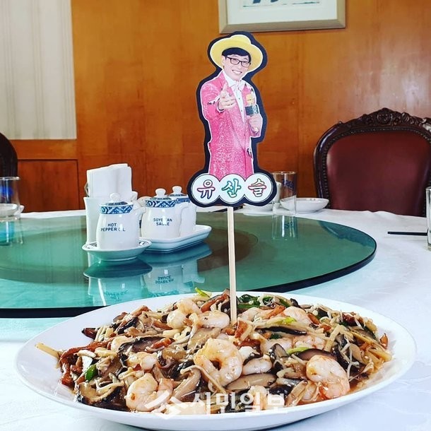 사진 속에는 해산물과 채소로 요리된 중식 유산슬과 유산슬의 소형 판넬이 같이 어우러져 웃음을 자아냈다.