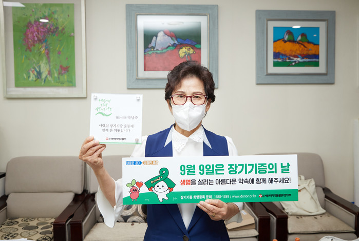 [용인=오왕석 기자] 용인시의회 박남숙 의원은 9월 9일 장기기증의 날을 맞아 장기기증에 대한 인식제고와 활성화를 위한 ‘사랑의 장기기증운동’에 동참해 달라고 말했다.