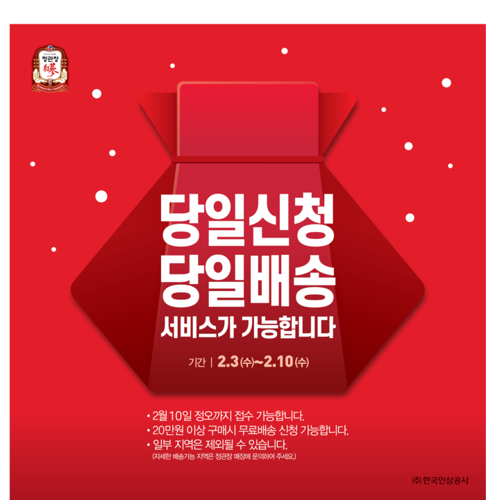 [시민일보 = 고수현 기자] KGC인삼공사가 미리 선물을 구매하지 못한 고객을 위해 정관장 제품을 당일 주문해 당일 배송 받을 수 있는 ‘당일신청·당일배송' 서비스를 3일부터 오는 10일 낮 12시까지 8일간 시행한다.
