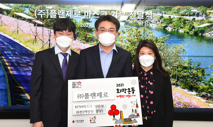 서울 노원구가 최근 마스크 판매업체 (주)플랜제로로부터 KF94 마스크 10만장(6500만원 상당)을 기부받았다. 이날 전달 받은 마스크는 코로나19 방역을 위해 구민들에게 배부할 예정이다. 사진은 오승록 구청장(가운데)이 마스크를 전달 받은 후 기념촬영을 하는 모습. (사진제공=노원구청)