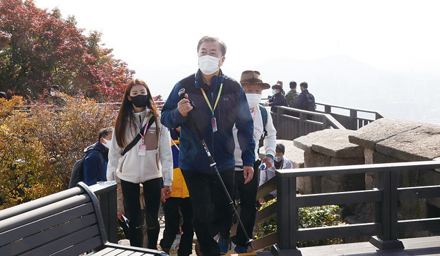 문재인 대통령이 지난 10월31일 청와대 뒤편 북악산 북측 탐방로를 산행 중 곡장전망대에 오르고 있다. 1968년 김신조 사건(1·21 사태) 후 일반인의 출입이 제한돼온 북악산 북측 탐방로는 둘레길로 조성돼 다음날인 1일부터 일반에 개방됐다. /연합뉴스