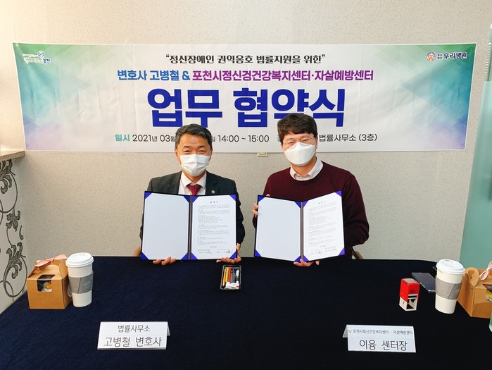 경기 포천시정신건강복지센터·자살예방센터는 최근 소흘읍에 위치한 고병철 변호사와 업무협약을 체결하고 경제적 곤란·재산상속 등 사회적 고립상태에 놓인 중증정신질환자들을 대상으로 1대1 맞춤형 법률 상담 서비스를 제공한다. 사진은 협약식에서 관계자들이 기념촬영을 하는 모습. (사진제공=포천시청)