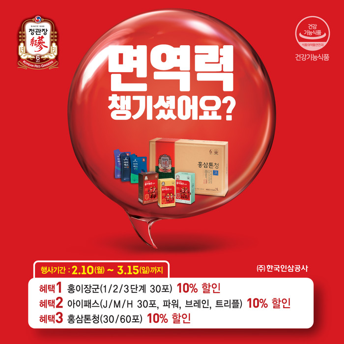 총 35일간 진행되는 이번 프로모션에서는 ‘홍이장군’, ‘아이패스’ 자녀류 홍삼과 환절기 제품인 ‘홍삼톤청’ 등의 제품 구매시 다양한 구매 혜택을 제공한다.