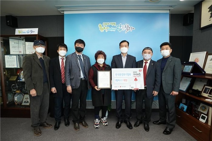 서울 성북구는 최근 사단법인 한국환경복지협회로부터 덴탈마스크 5만장을 기부받았다. 사진은 전달식에서 이승로 구청장(오른쪽에서 세 번째)과 한국환경복지협회 관계자들이 기념사진을 찍고 있는 모습. (사진제공=성북구청)